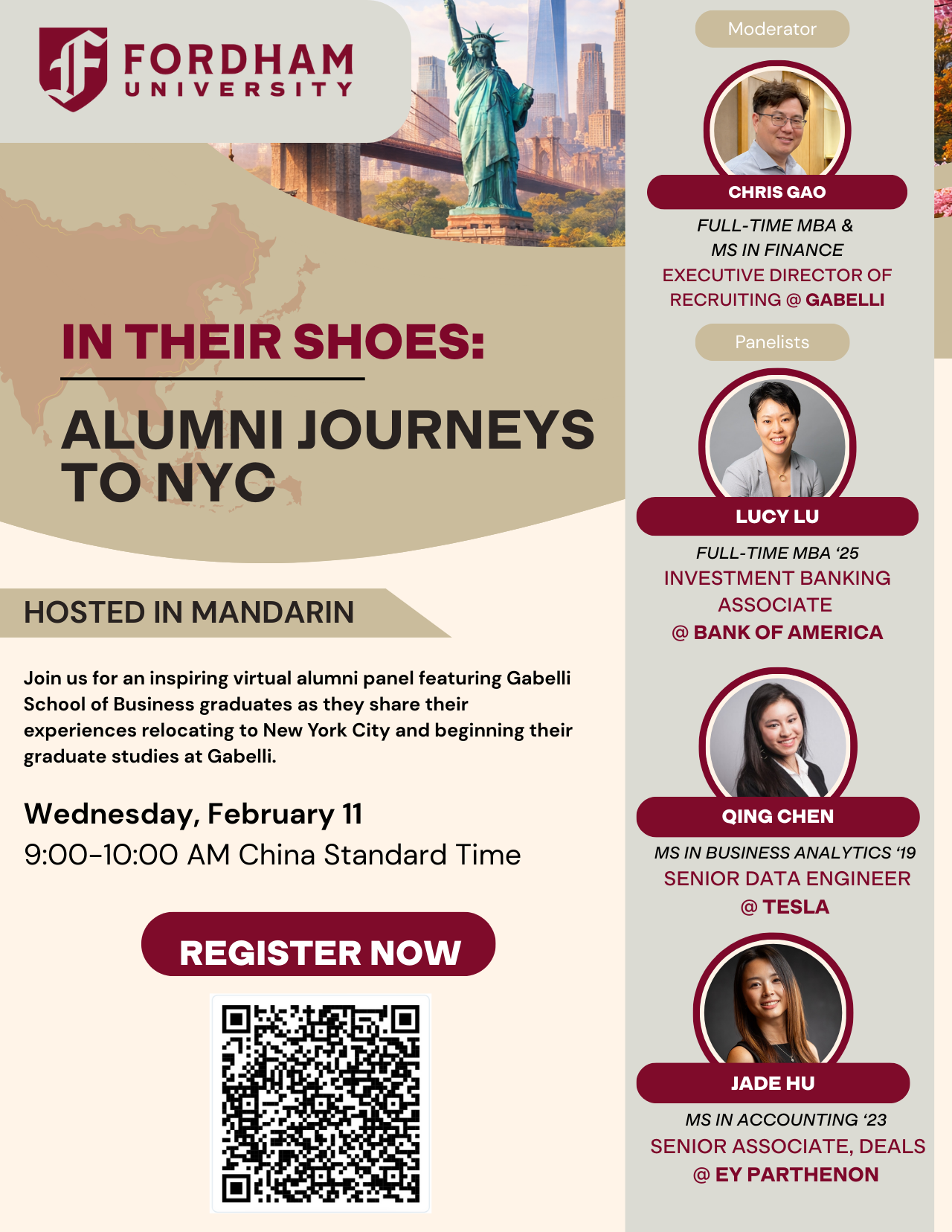 Join us for an inspiring alumni panel featuring Gabelli School of Business graduates as they share their experiences relocating to New York City and beginning their graduate studies at Gabelli - in Mandarin.